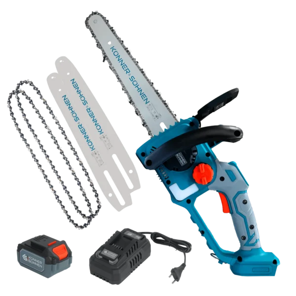 Saksa kaubamärgi Könner & Söhnen juhtmeta mini-kettsaag KS MCS20V-12 SET ühendab endas võimsuse, liikuvuse ja mugavuse. Harjadeta mootor 5-aastase garantiiga tagab kõrge jõudluse ja vastupidavuse, samas kui 20V aku võimaldab juhtmevaba kasutamist. 10 m/s ketikiirus ja 12-tolline (30 cm) latt teevad selle ideaalseks okste lõikamiseks, küttepuude ettevalmistamiseks ja puidutöödeks. Selle tasakaalustatud disain, kerge kaal ja ergonoomiline ümar käepide vähendavad töö ajal väsimust. Kahekordne kaitse, turvalukustusnupp ja vööaas tagavad ohutuse, samas kui tööriistavaba keti pingutamise mehhanism ja automaatne määrimine lihtsustavad hooldust. Komplekt sisaldab akut, laadijat, kahte latti ja kahte ketti.