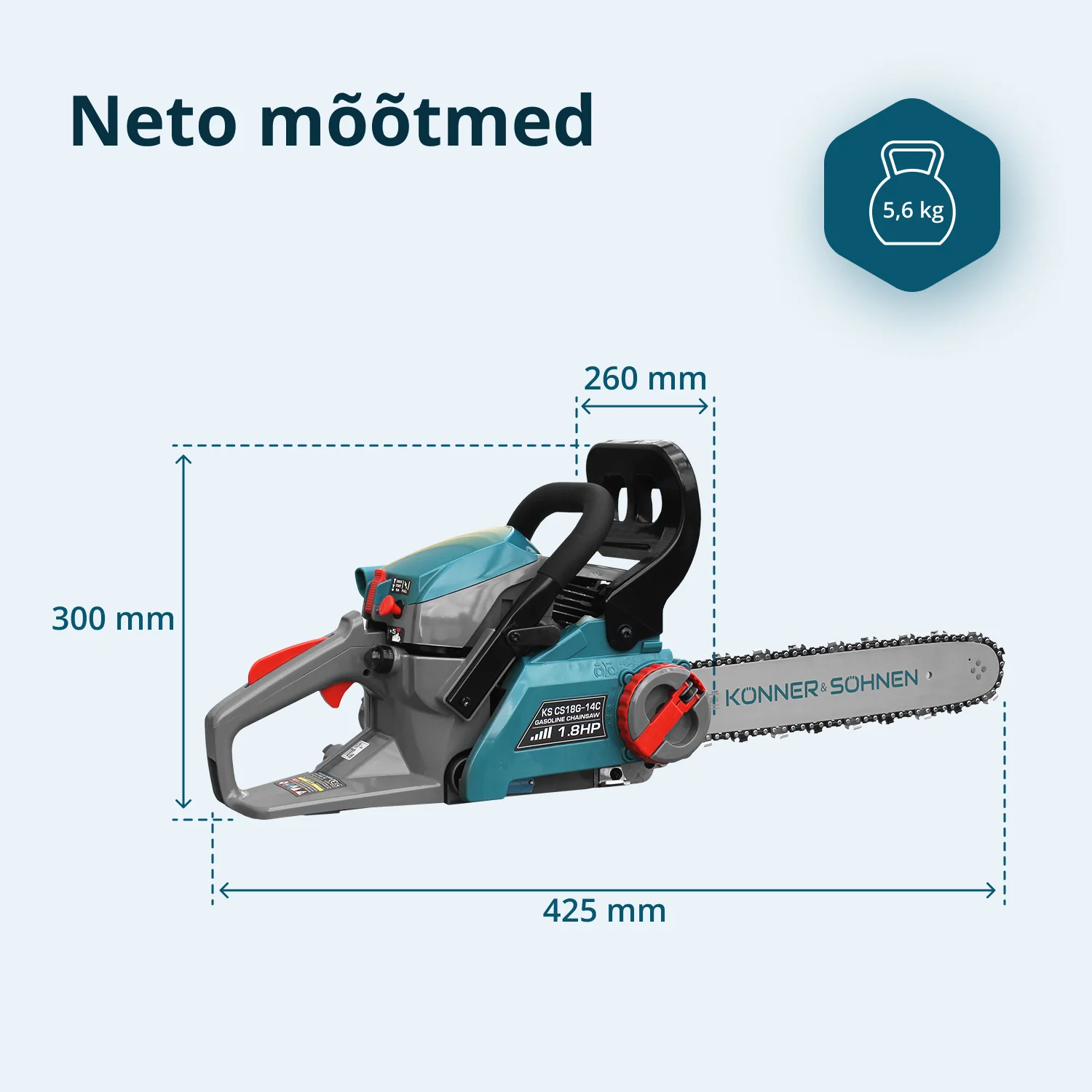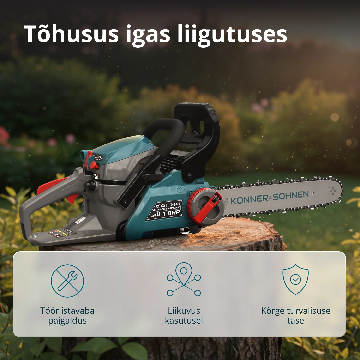 Saksa brändi Könner & Söhnen® bensiinimootorsaag KS CS18G-14C (35 cm latt, 1,35 kW, 13000 p/min) — usaldusväärne tööriist koduseks kasutamiseks. Usaldusväärne mootor tagab tõhusa kütuse põlemise. Kiire ligipääsuga filtri klamber lihtsustab hooldust. „Suvi/Talv” režiimid kaitsevad karburaatorit jäätumise eest, samas kui inertsipidur peatab keti koheselt. Mugavusfunktsioone täiustavad automaatne STOP/START nupp, tööriistavaba keti pingutamine, „Easy Start” süsteem, ergonoomiline käepide kindlaks haardeks igas asendis.