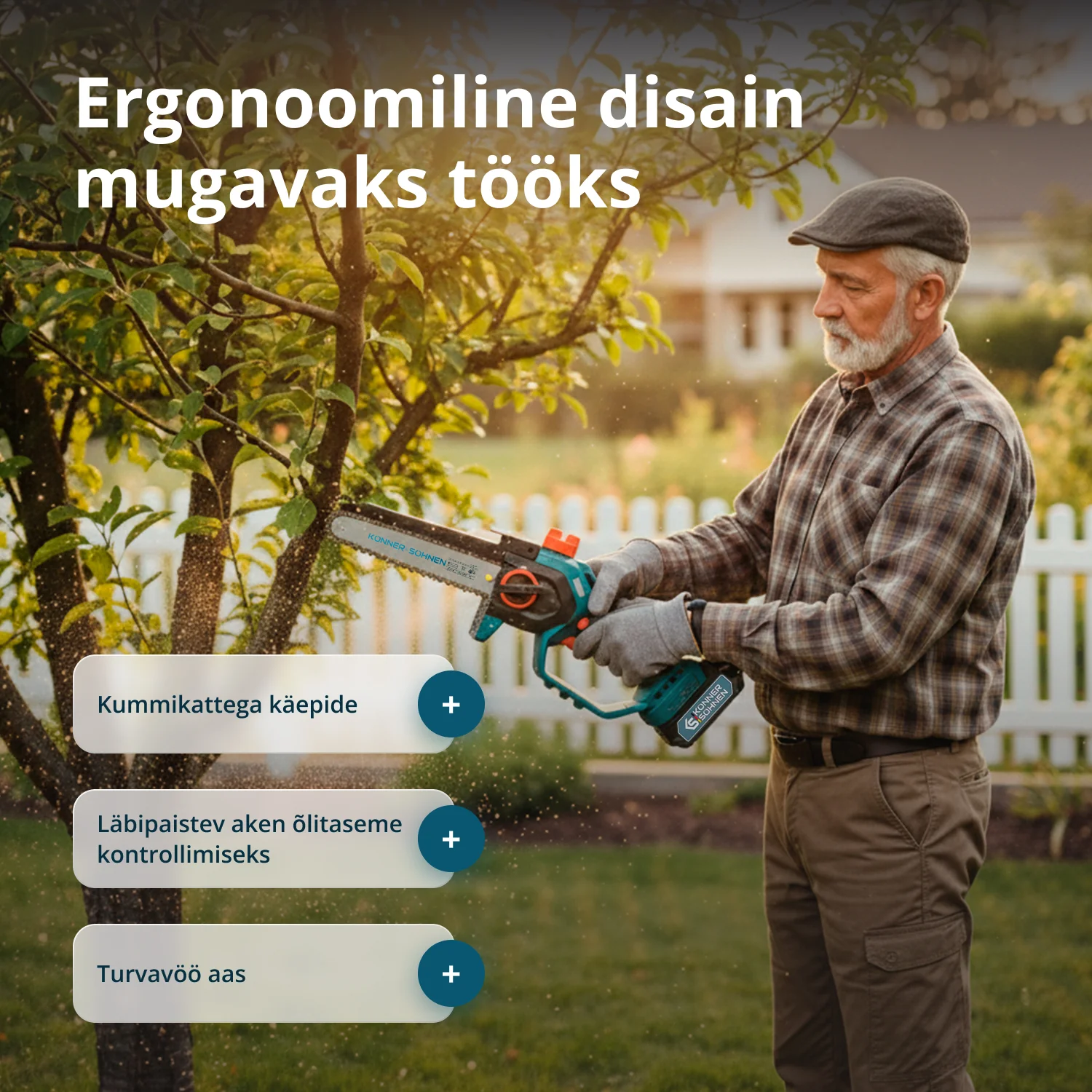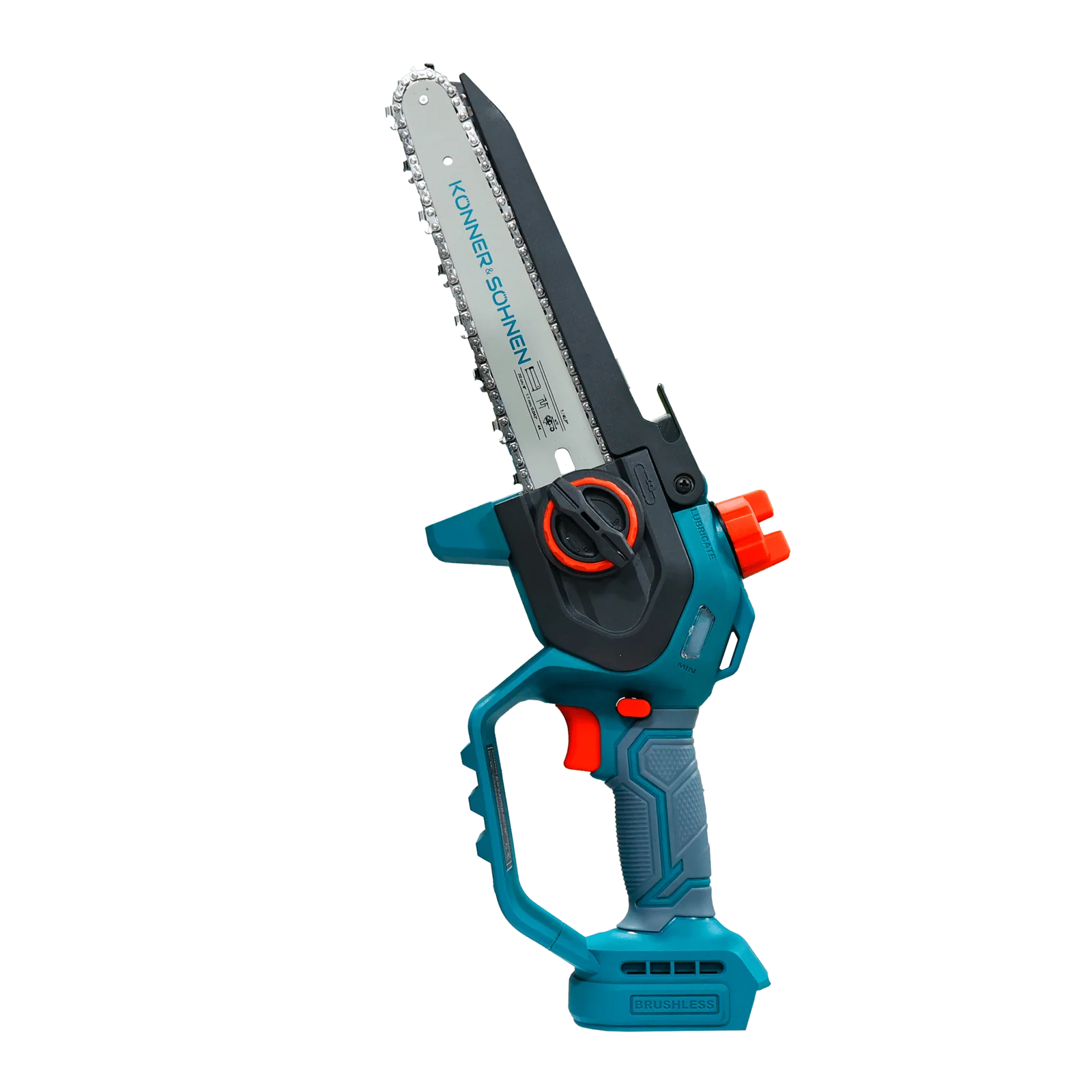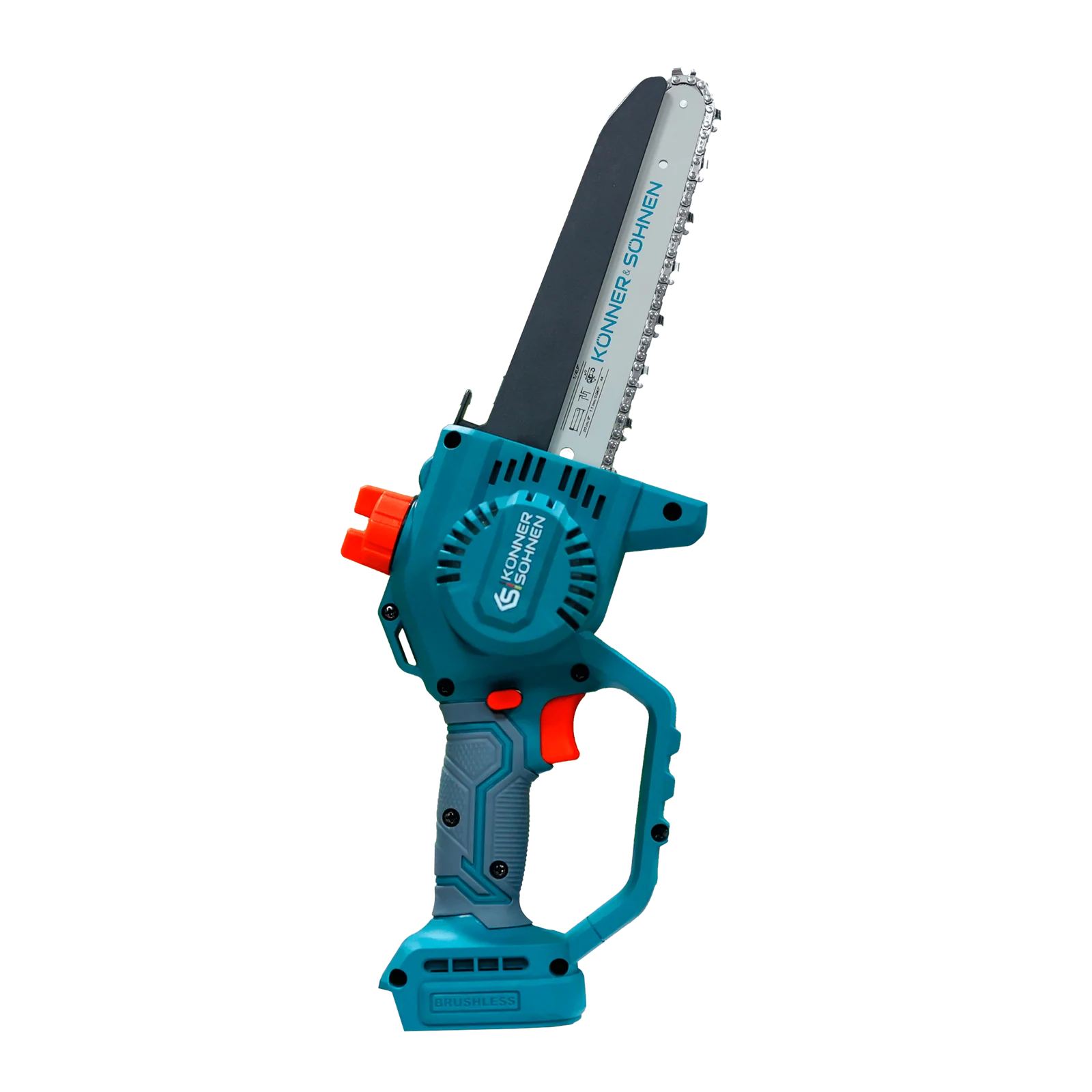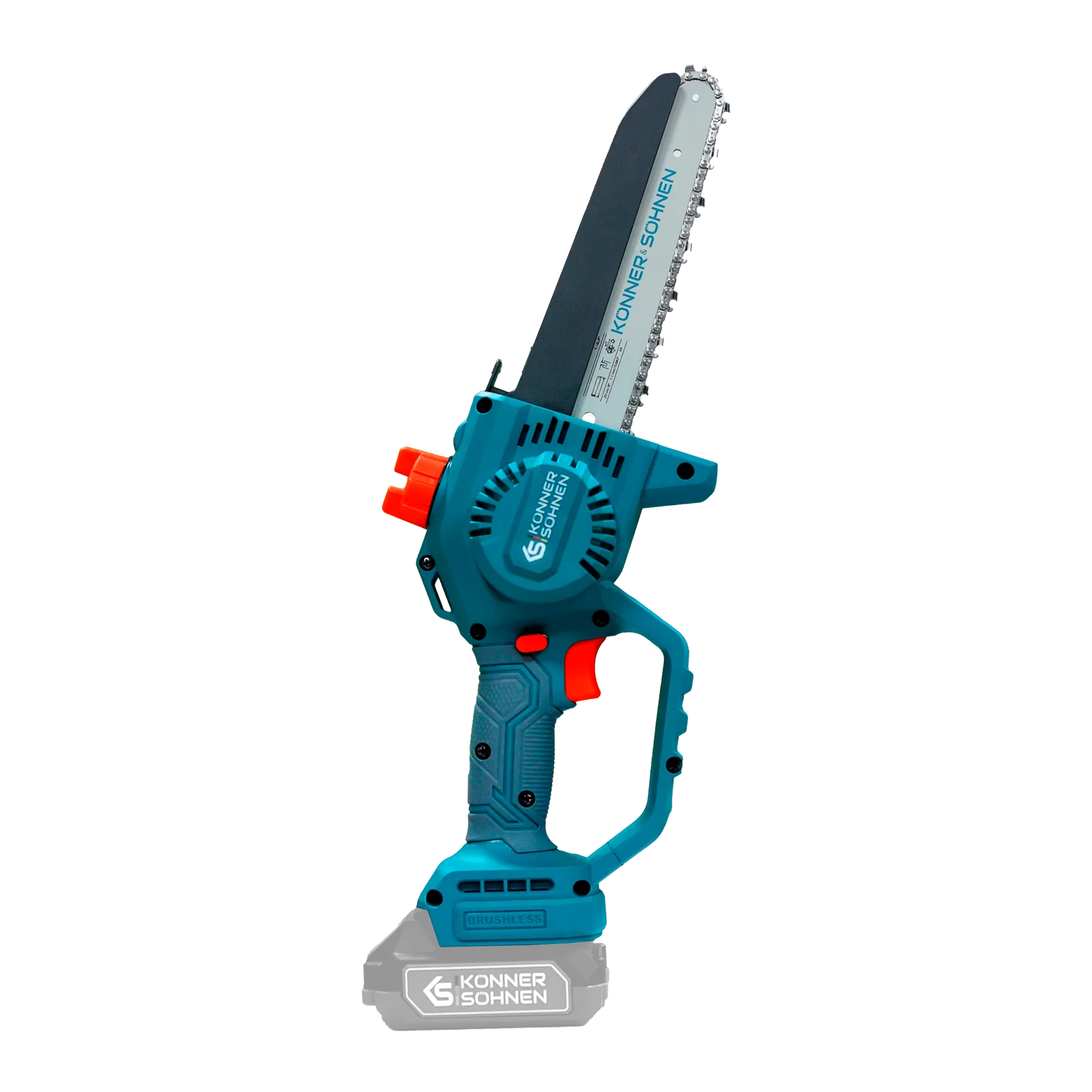 Könner & Söhnen KS MCS20V-8 juhtmeta mini kettsaag (ilma aku ja laadijata) on varustatud 8-tollise (20 cm) lati ja 8 m/s ketikiirusega, muutes selle usaldusväärseks tööriistaks aiatöödel. Selle võimas harjadeta mootor, millele kehtib 5-aastane garantii, töötab vaikselt, sujuvalt ja usaldusväärselt. Kompaktne korpus ja ergonoomiline kummist käepide tagavad mugavuse ja kontrolli, isegi ühe käega kasutamisel. Ohutuse tagamiseks on sellel turvalukk, kaitsepiirded ja kilp. Mugavusfunktsioonide hulka kuuluvad tööriistavaba keti pingutamine, automaatne ketiõlitamine ja õlitaseme aken.