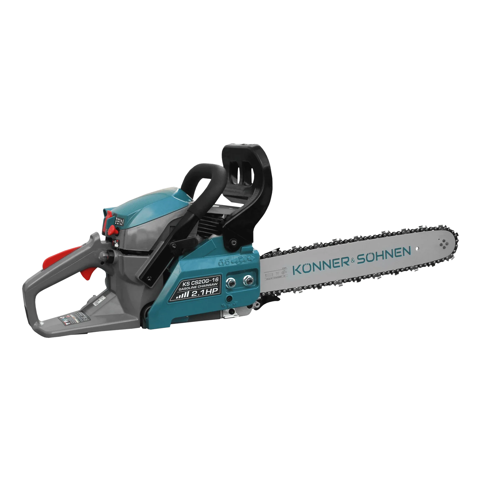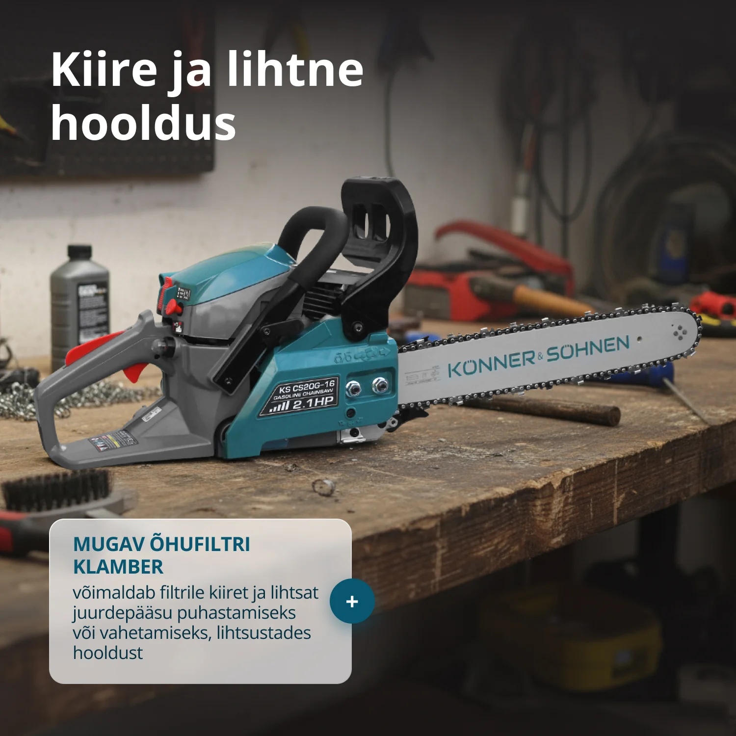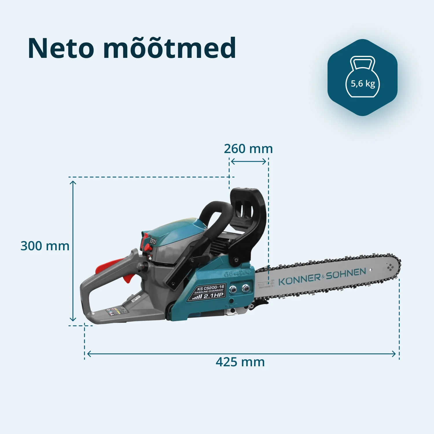 Könner & Söhnen® KS CS20G-16 kettsaag (2,1 hj, 1,6 kW, 40 cm latt) ühendab jõudluse, töökindluse ja kasutusmugavuse. Usaldusväärne mootor tagab tõhusa kütuse põlemise, vähendab tarbimist ja suurendab võimsust. “Suvi/Talv” režiim kaitseb karburaatorit jäätumise eest. Ohutusfunktsioonide hulka kuuluvad inertsiahelapidur, naelapõrkeraud, ahelapüüdja ja gaasiluku nupp. EASY START, primer ja automaatne STOP-nupp tagavad vaevatu käivitamise. Külgmine ahela pingutamine, kiire juurdepääs õhufiltrile ja ergonoomiline ümar käepide kummist kattega muudavad töö mugavaks ka pikaajalisel kasutamisel.